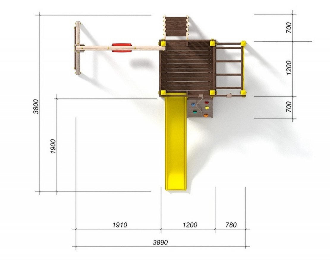 Для максимальной защиты ребёнка от травм, все углы имеют закруглённую форму, крепеж скрыт пластиковыми заглушками. Опоры изготовлены из клеёного бруса толщиной 90*90 мм. Изделие покрыто безопасной для детей высокоустойчивой краской на водной основе, которая надежно защищает древесину от воздействия окружающей среды. Перила, скалодром и лестница производятся по системе "шип паз".