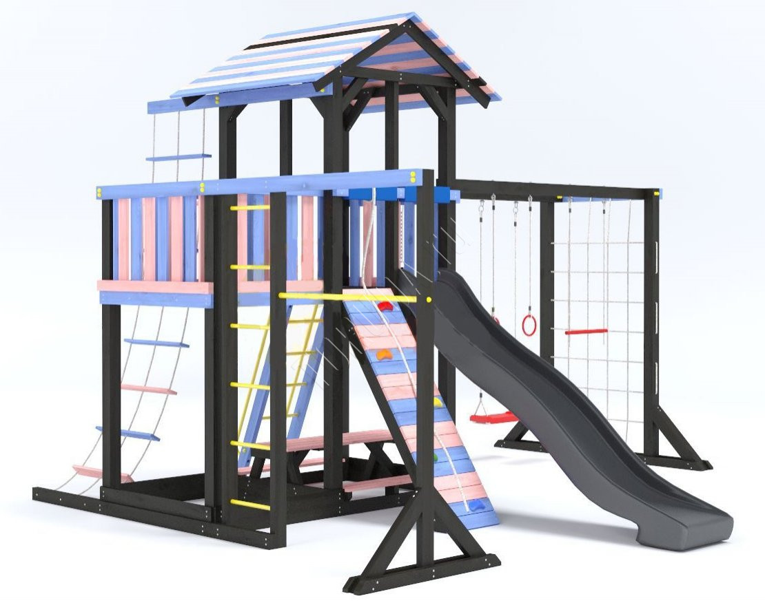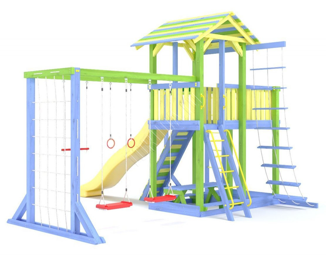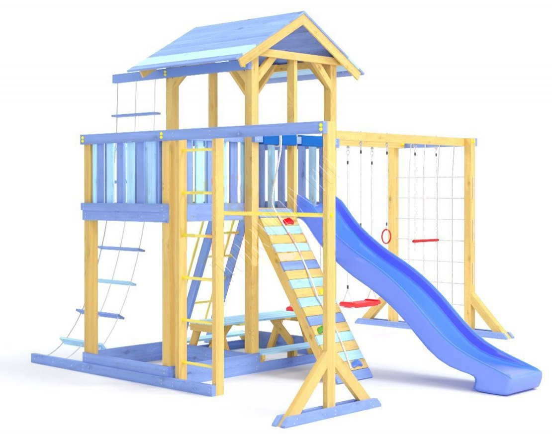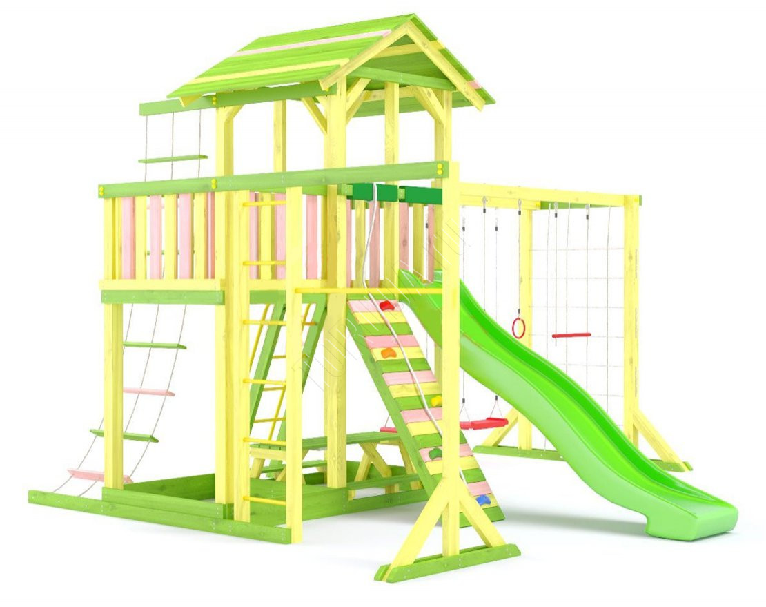 - Комплектующие игровой площадки изготовлены из всесезонного пластика и клееного бруса повышенной прочности, что обеспечивает полную безопасность и вместе с тем прочность и долговечность конструкции.