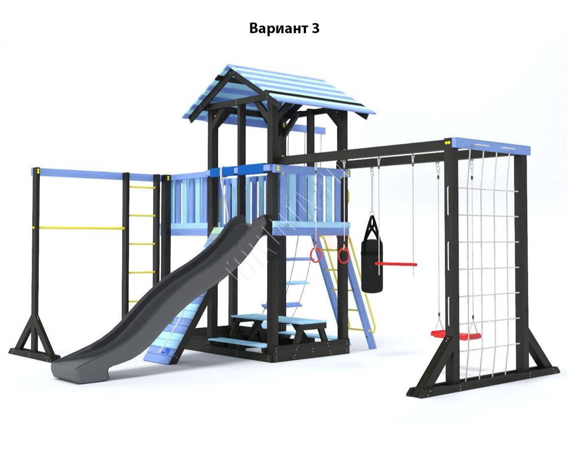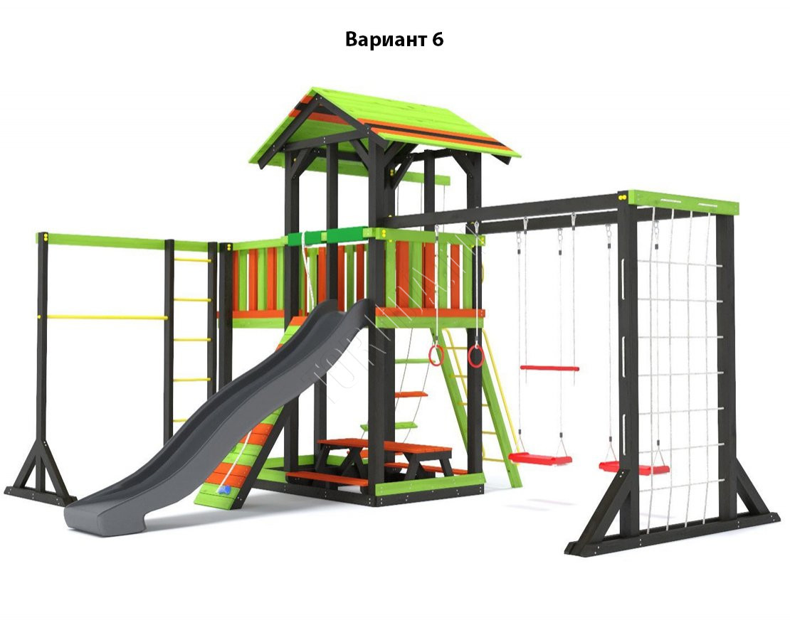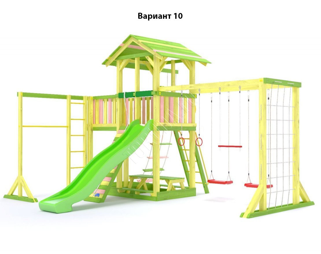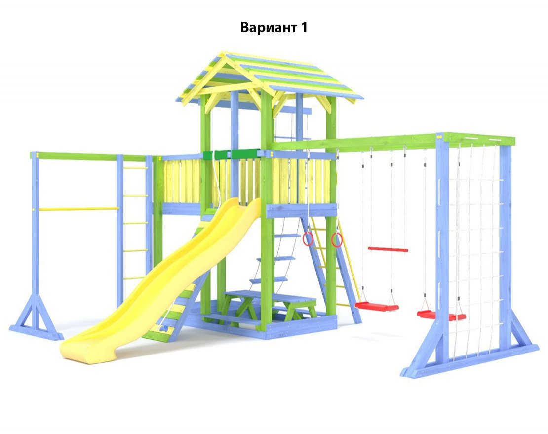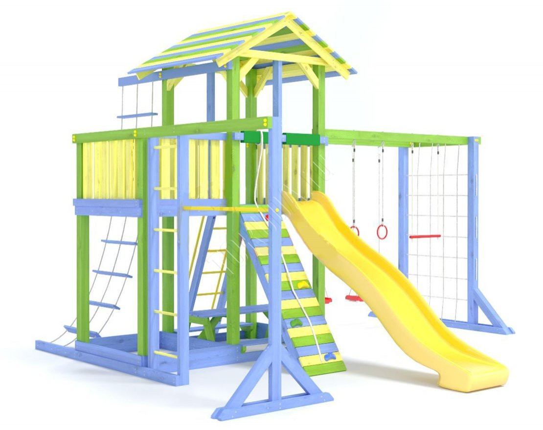 - Комплектующие игровой площадки изготовлены из всесезонного пластика и клееного бруса повышенной прочности, что обеспечивает полную безопасность и вместе с тем прочность и долговечность конструкции.