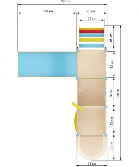 Сооружение смело можно назвать домиком, потому что оно наделено окошками, дверкой. В качестве спортивно-развлекательных модулей имеются лесенка с разноцветными ступеньками, волновая горка, шест, многочисленные фигурные выемки для лазания и декора.