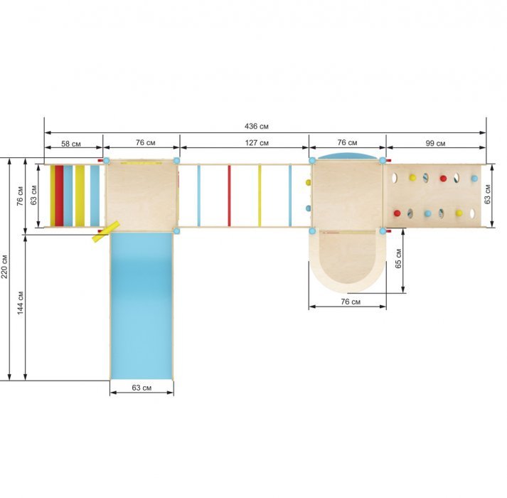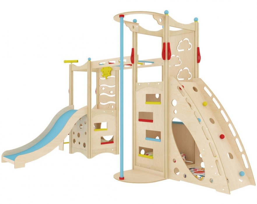 Стильный дизайн модели прекрасно впишется в интерьер квартиры, дома, детского магазина, кафе и пр. Дерево и ненавязчивые разноцветные элементы, фигурные прорези на панелях – конструкция смотрится легко и изящно, несмотря на внушительные габариты.