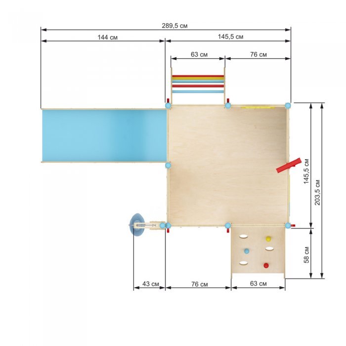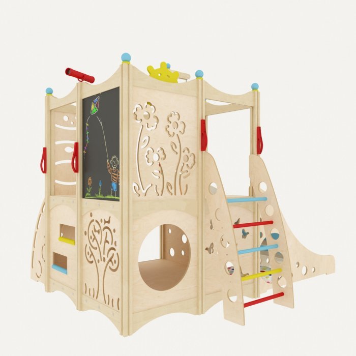 Фанера из берёзы – основной материал игрового комплекса. Эстетичный внешний вид ему придаёт масляная пропитка на нетоксичной основе. Все углы сглажены, поэтому риск получить травму сводиться к минимуму.