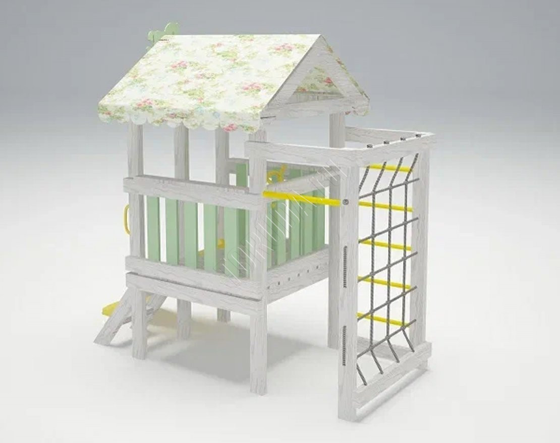 Конструкция модели разработана согласно действующим российским ГОСТам. Основной материал – массив дерева. Сечение элементов рамы 45 х 90 мм. Поверхность каркаса гладкая. Все углы закруглены, а шляпки крепежа спрятаны за яркими заглушками. Также дерево обязательно покрывается в два слоя безопасной краской.