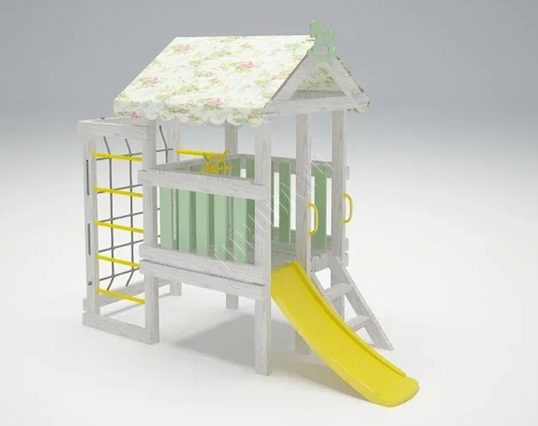 - В игровой зоне на платформе (60 см от пола) расположен домик с крышей. Зайти внутрь ваш ребёнок сможет по удобной, прочной лестнице. Внутри установлен руль-штурвал. Наигравшись наверху, малыш может спуститься обратно вниз, скатившись по яркой пластиковой горке или воспользовавшись лестницей.