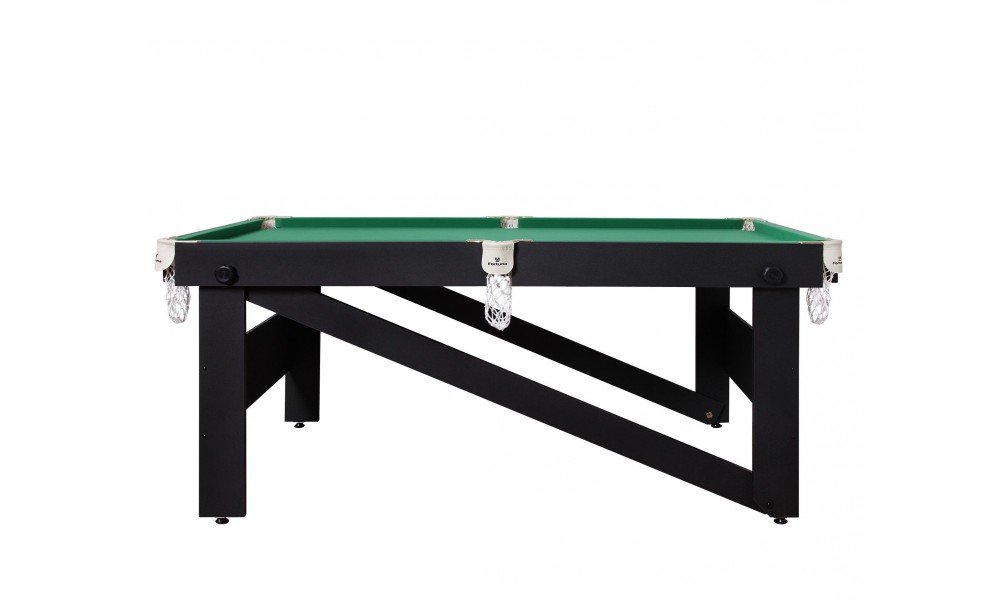 Модель поставляется с комплектом всех необходимых для игры аксессуаров: двусоставные кии (2 шт.), набор из 16-ти шаров, два мела, треугольник и щетка для ухода за поверхностью сукна.