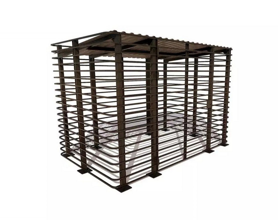 Контейнерные площадки изготовлены из профильного материала, не имеют сплошных стенок и оснащены калиткой с замком. Крыша выполнена из профильного листа, установлена под небольшим наклоном. Объект рассчитан на два стандартных мусорных бака. В конструкции имеются каркасные направляющие с установочными площадками в нижней части. За счет нескольких монтажных оснований объект размещается на неровной поверхности. Калитка с замком располагается по центру широкой части, ворота легко открываются и не касаются земли. Для облагораживания территории на небольшом участке советуем купить контейнерные площадки сквозной конструкции, которые не выглядят массивными.