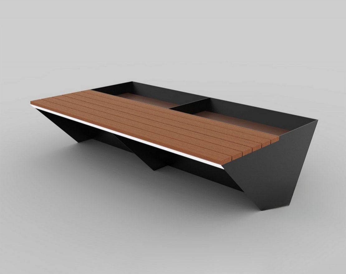Скамья с совмещёнными клумбами или местами для установки цветочных горшков. Позволяет добиться интересных визуальных эффектов и совместить озеленение с удобством расположения людей.