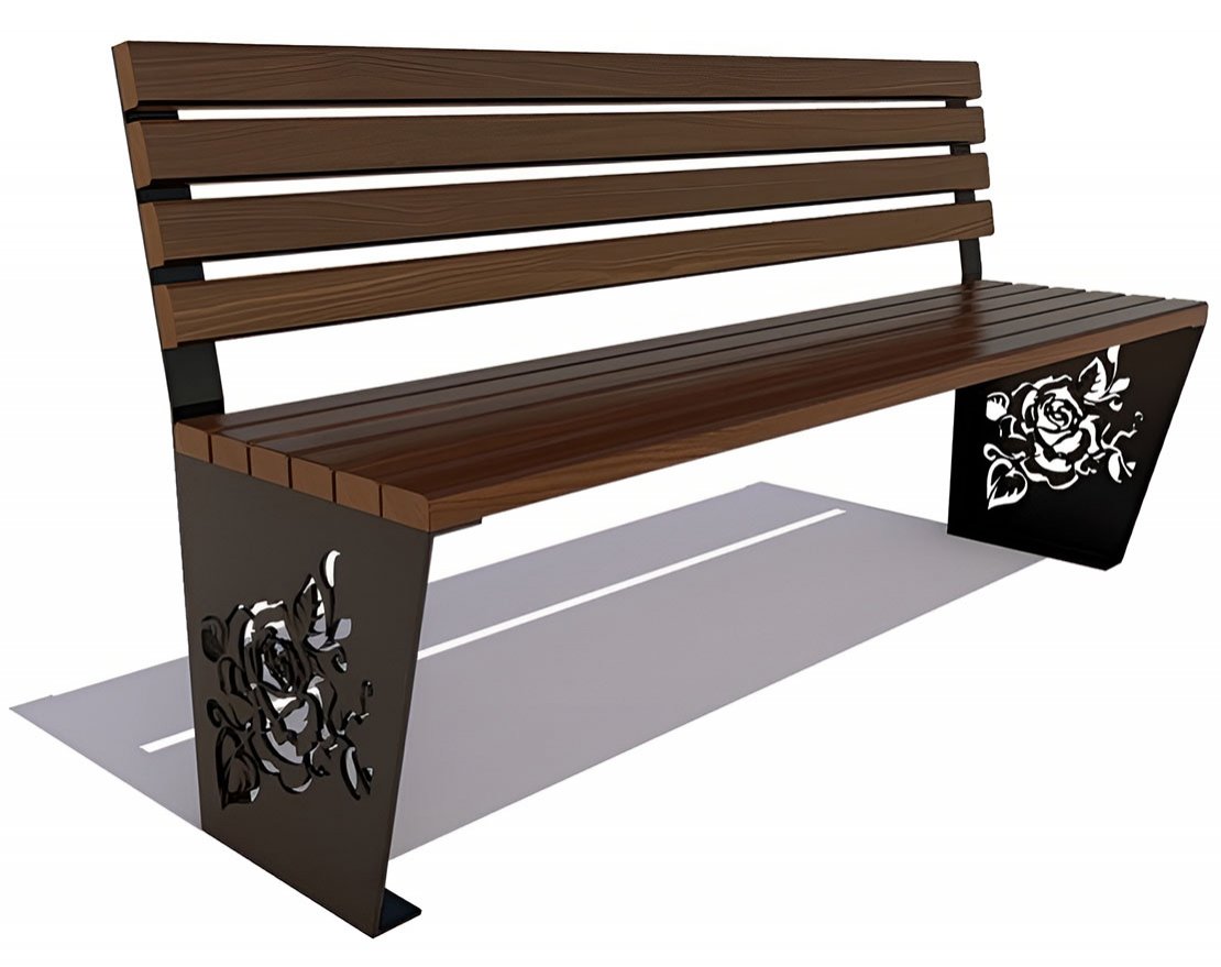 Красивая скамейка «Роза» без подлокотников — идеальное украшение дачного участка или парка и сквера. Каркас ее сделан из листовой стали, боковины украшены рисунком, выполненным лазером, в виде распустившейся розы. Сидения из ангарской сосны или лиственницы окрашиваются в 5 цветов по каталогу RAL.