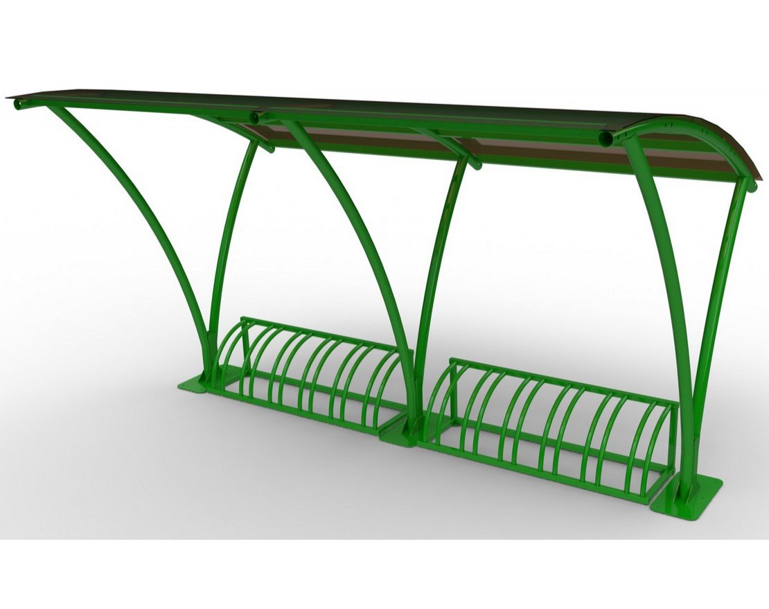 Велопарковка с навесом "Мегаполис" устанавливается в парках, зонах отдыха, у торговых центров, офисных зданий и других городских локаций. Обеспечивает упорядоченное размещение как вело-транспорта, так и самокатов, защищая от осадков и ультрафиолета.