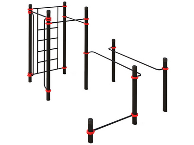 Комплекс состоит из восьми опорных столбов высотой: 3 шт. - 2550 мм., 1 шт. -2300 мм., 3 шт. - 1200 мм., 1 шт. - 400 мм., трех перекладин для подтягиваний длиной 1200 мм, перекладины для отжиманий, параллельных брусьев для колясочников и шведской стенки. Элементы крепятся к опорным столбам при помощи хомутов. Высота фиксации перекладин для подтягиваний: 1 шт. - 2300 мм, 1 шт. - 2100 мм и 1 шт. - 1800 мм. Перекладина для отжиманий фиксируется на высоте 250 мм. Шведская стенка крепится на высоте 2450 мм. Состоит из перекладин, расстояние между которыми 373 мм. Высота шведской стенки - 2073 мм, ширина - 1200 мм. Жерди брусьев крепятся к опорным столбам на высоте 1050 мм, расстояние между жердями 550 мм. Комплекс оснащен поручнями для инвалидов-колясочников.